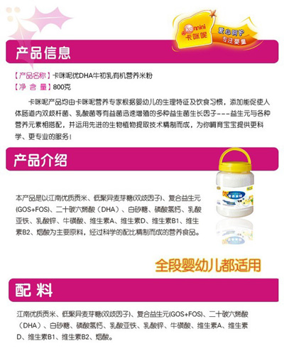 卡咪呢有機米粉系列是專為中國寶寶設(shè)計的營養(yǎng)輔食,選用有機大米,科學搭配維生素AD等維生素,還特別添加;撬、DHA、AA等有助智力發(fā)育的營養(yǎng)成分,富含15種營養(yǎng)素,F(xiàn)上?ㄟ淠啬笅胗闷酚邢薰久嫦蛉珖瞻资袌鰠^(qū)域誠招卡咪呢有機米粉代理商。