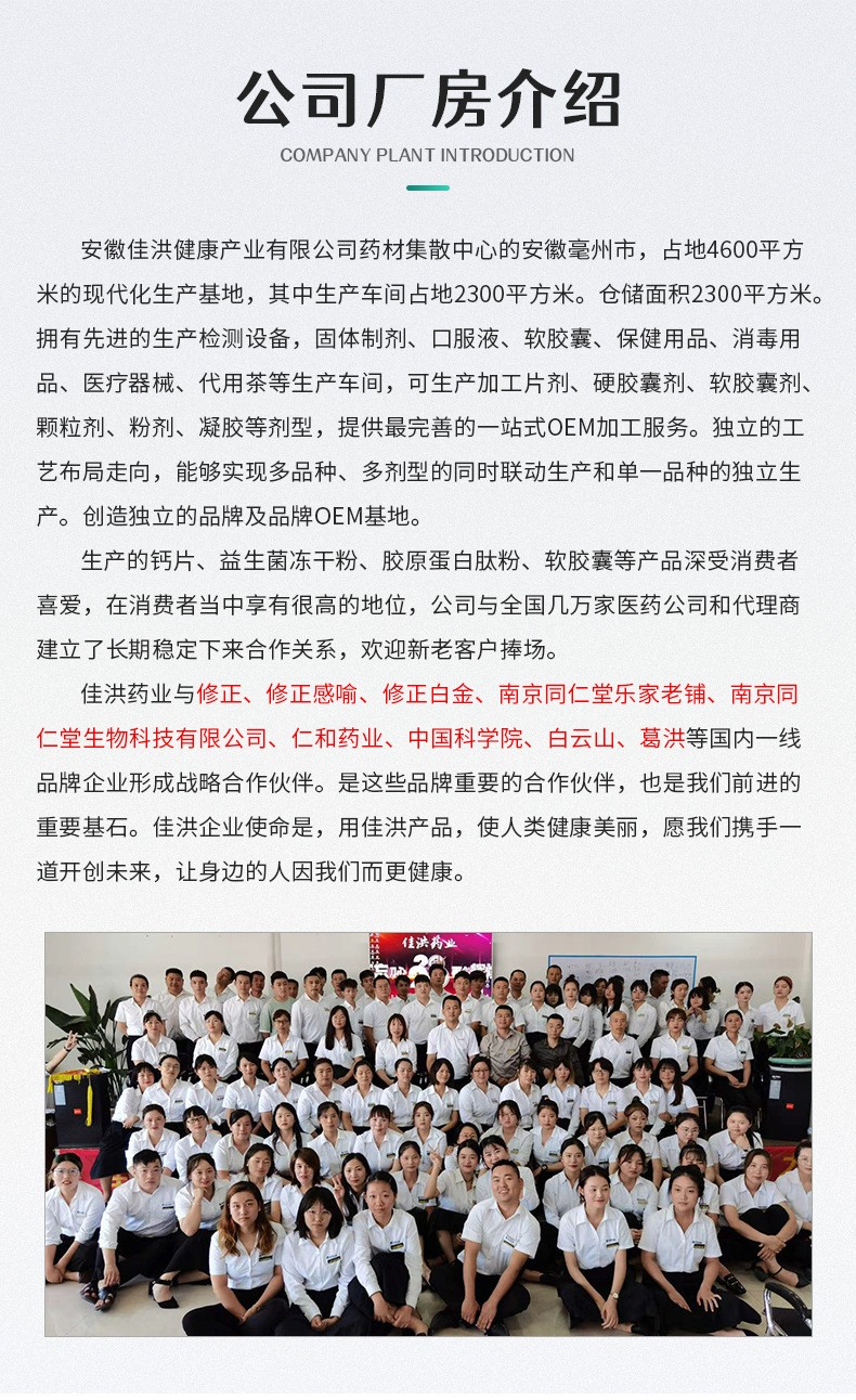安徽佳洪健康產(chǎn)業(yè)有限公司位于全球最大的中藥材集散中心安徽亳州市,占地4600平方的現(xiàn)代化生產(chǎn)基地,其中生產(chǎn)車間占地2300平。倉儲面積2300平。國際先進的生產(chǎn)檢測設(shè)備,固體制劑、口服液、軟膠囊、保健用品、消毒用品、醫(yī)療器械、代用茶等生產(chǎn)車間,可生產(chǎn)加工片劑、硬膠囊劑、軟膠囊劑、顆粒劑、粉劑、凝膠等劑型,提供最完善的一站式OEM加工服務(wù)。獨立的工藝布局走向,能夠?qū)崿F(xiàn)多品種、多劑型的同時聯(lián)動生產(chǎn)和單一品種的獨立生產(chǎn)。創(chuàng)造獨立的品牌及品牌OEM基地。