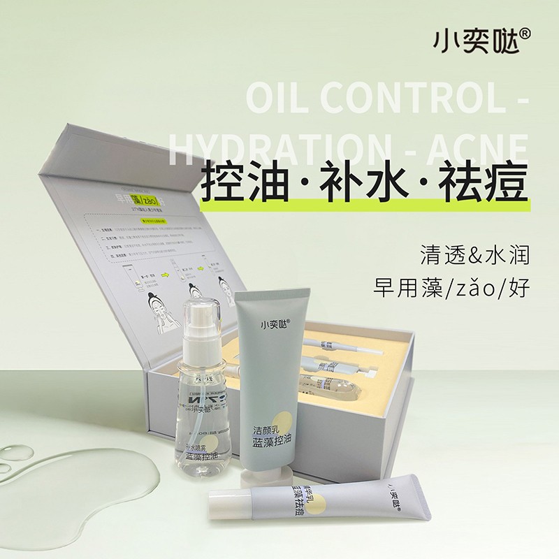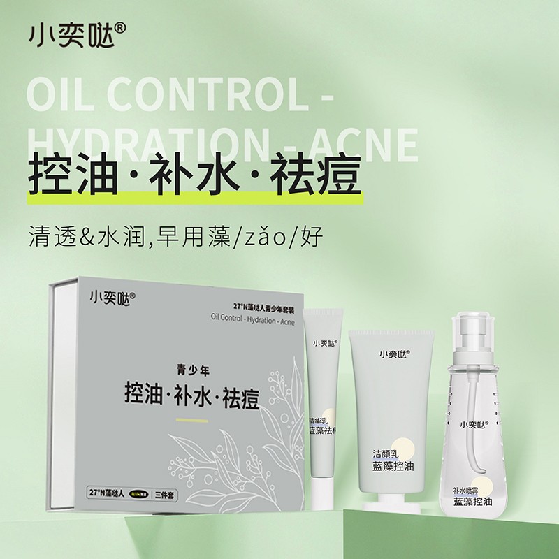 小奕噠青少年藍(lán)藻控油補(bǔ)水祛痘三件套,包含:藍(lán)藻控油潔顏乳+藍(lán)藻控油補(bǔ)水噴霧+藍(lán)藻祛痘精華乳,控油、補(bǔ)水、祛痘,清透水潤。