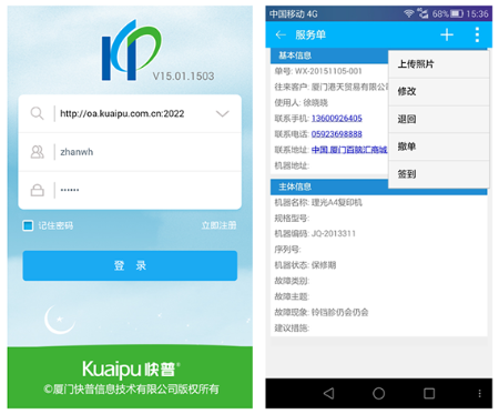 移動(dòng)服務(wù)接單、機(jī)器二維碼掃描、手機(jī)拍照定位、機(jī)器新增查詢、耗材查詢、客戶新增查詢、實(shí)時(shí)庫存查詢、知識(shí)庫查詢、應(yīng)收款及對(duì)帳、移動(dòng)辦公及審批等;