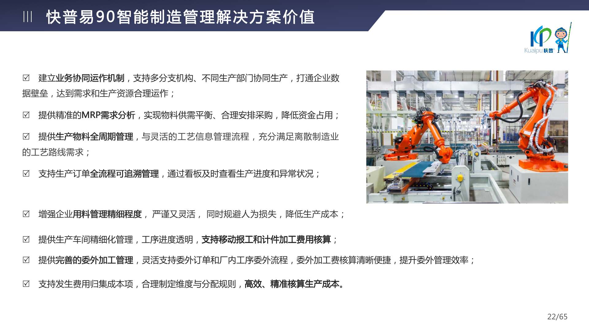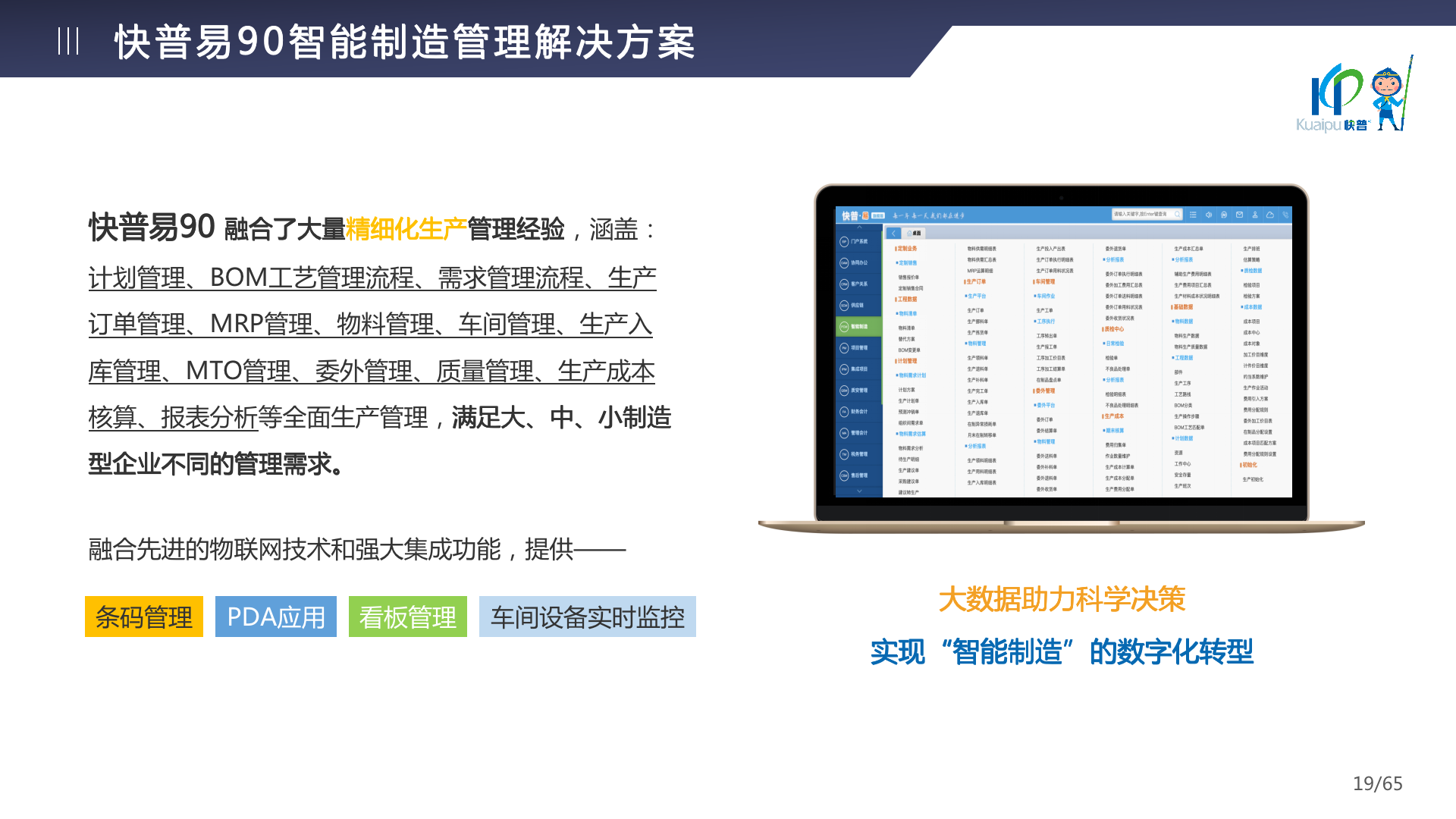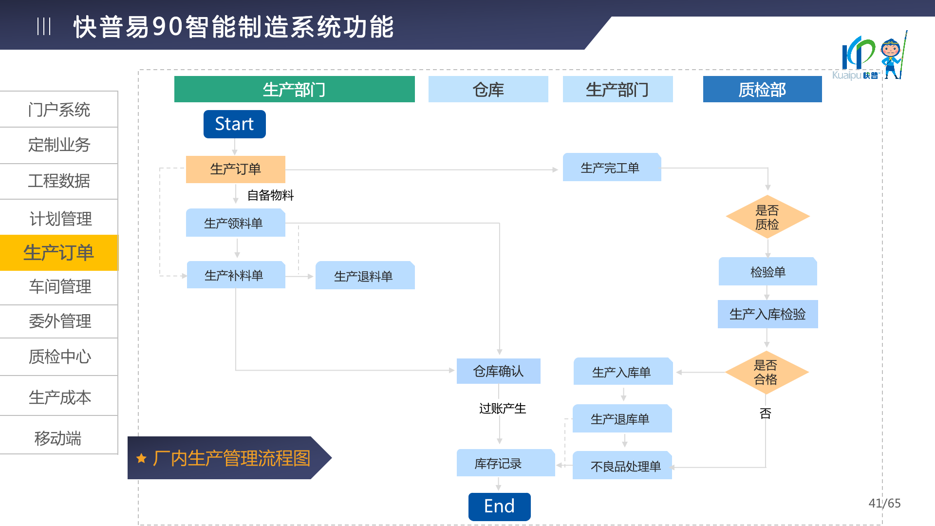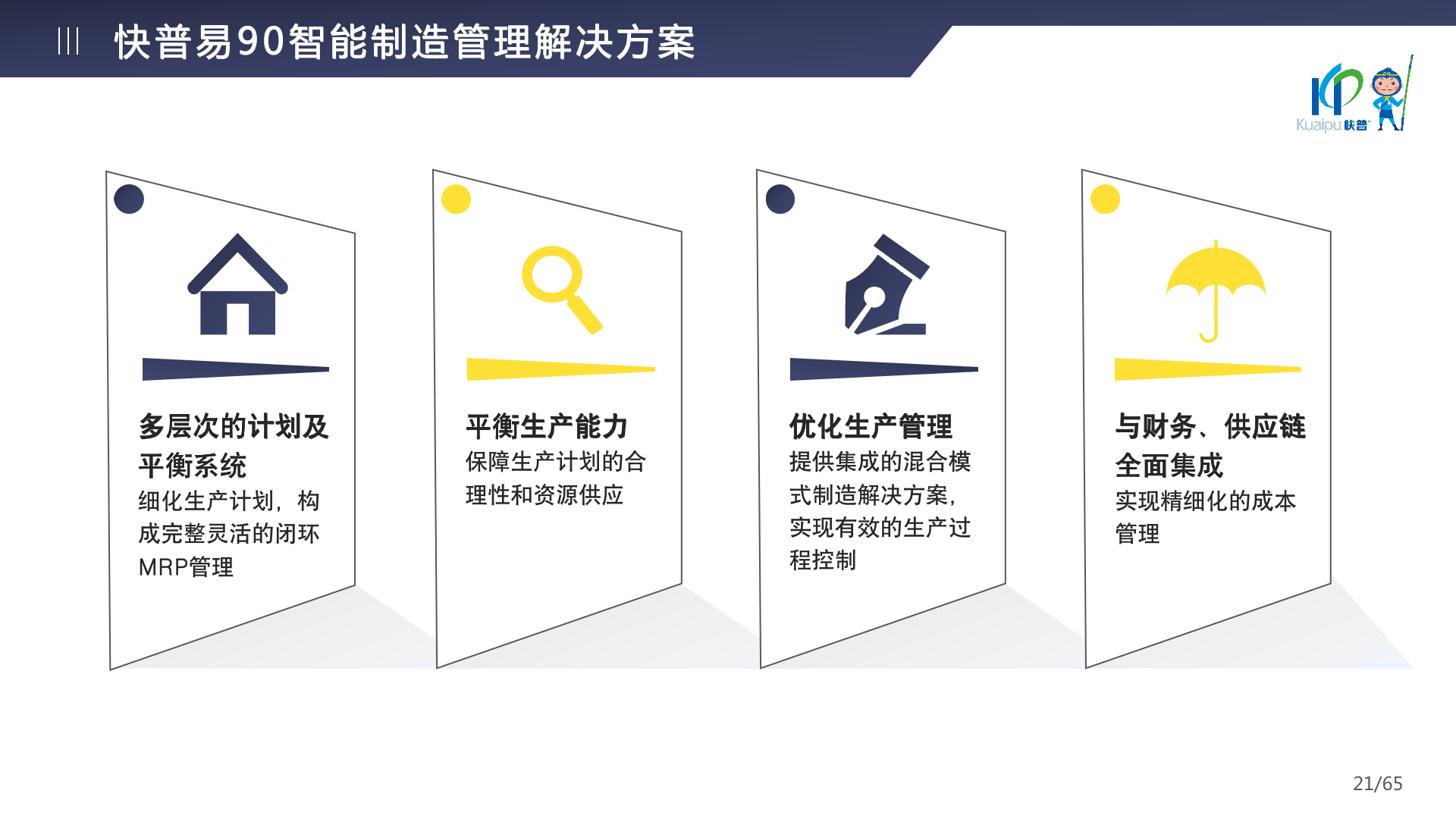 快普易90融合了大量精益生產(chǎn)管理的經(jīng)驗(yàn),涵蓋計(jì)劃管理、BOM管理、MRP運(yùn)算、生產(chǎn)訂單管理、供應(yīng)鏈管理、車間管理、出入庫(kù)管理、委外管理、質(zhì)量管理、生產(chǎn)成本核算、報(bào)表分析等全面生產(chǎn)管理,為企業(yè)打造實(shí)時(shí)感知變化、分析變化、提供決策的數(shù)字化管理平臺(tái),推動(dòng)企業(yè)創(chuàng)新的管理,實(shí)現(xiàn)“智能制造”的數(shù)字化轉(zhuǎn)型。