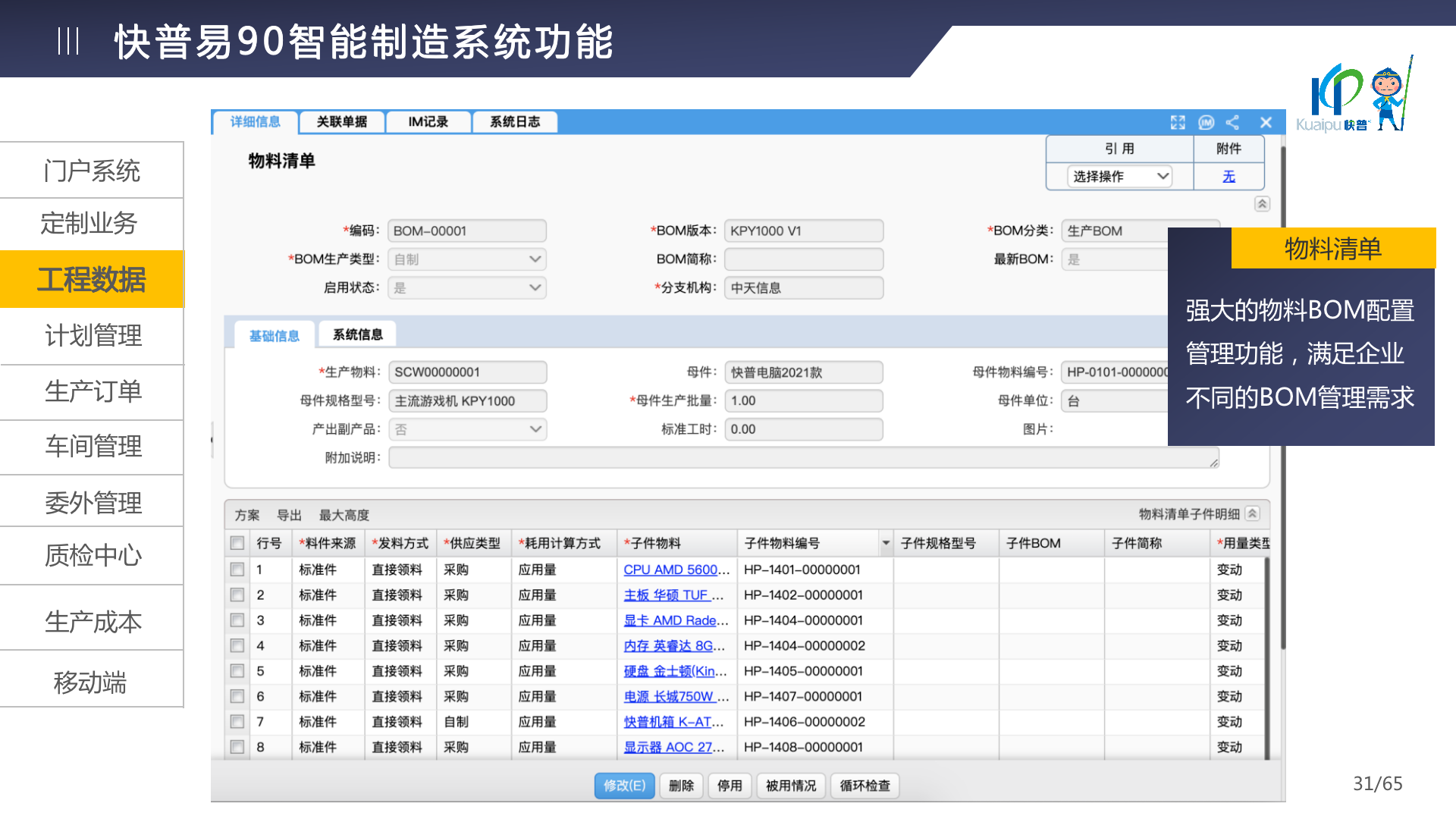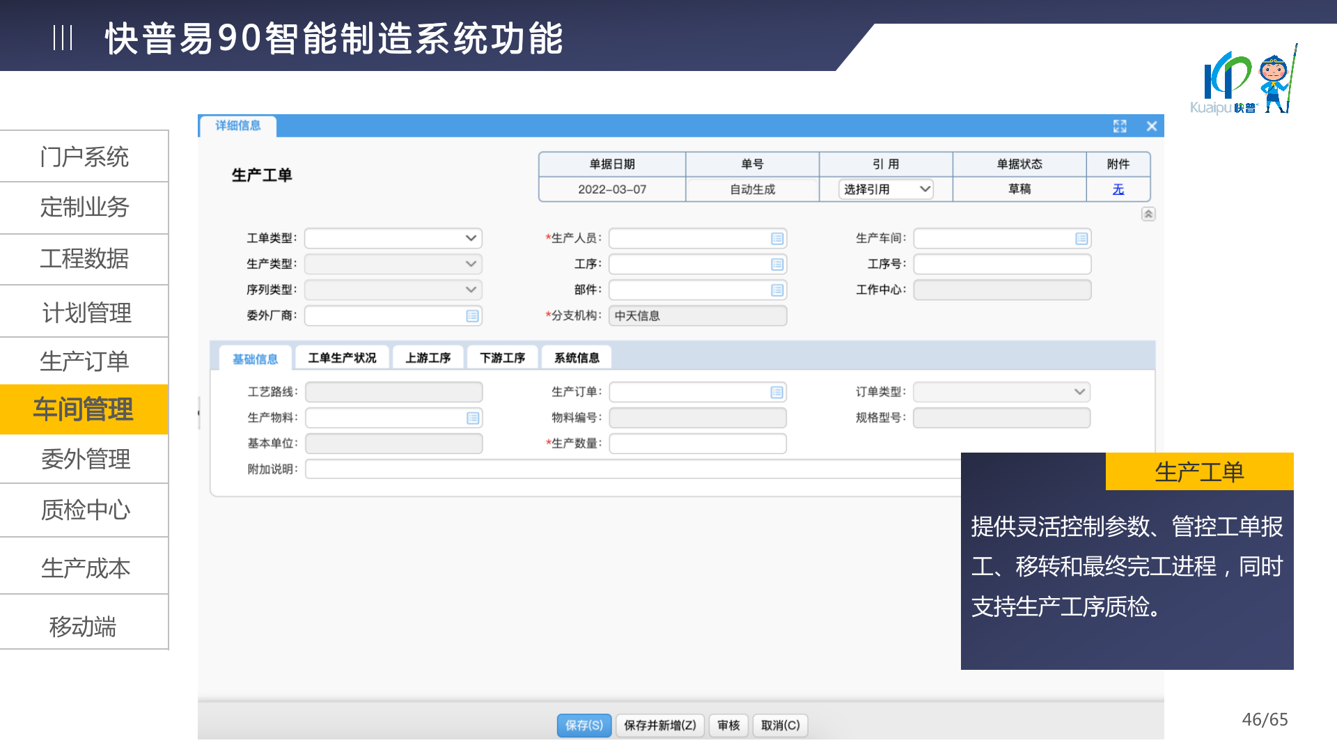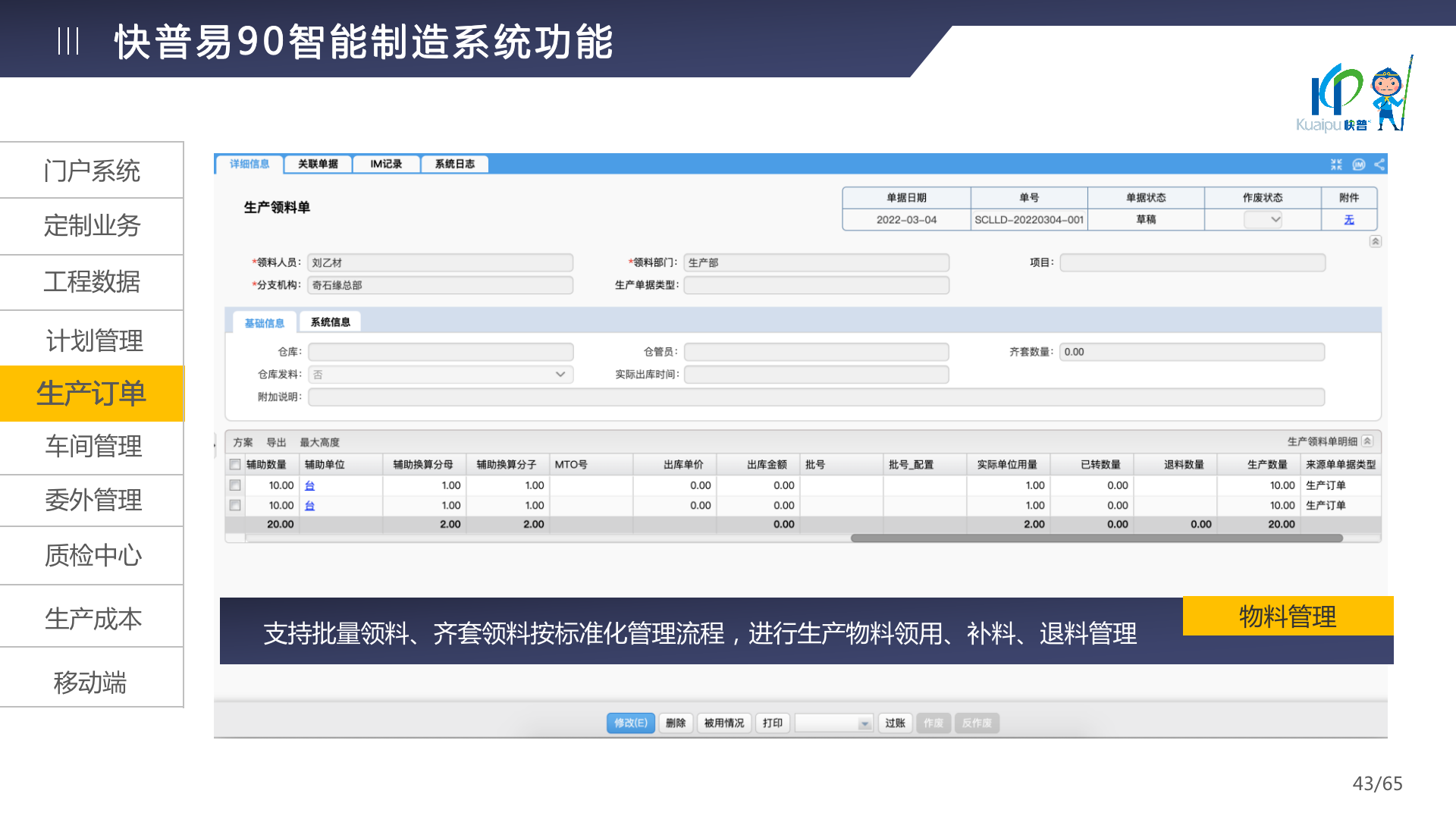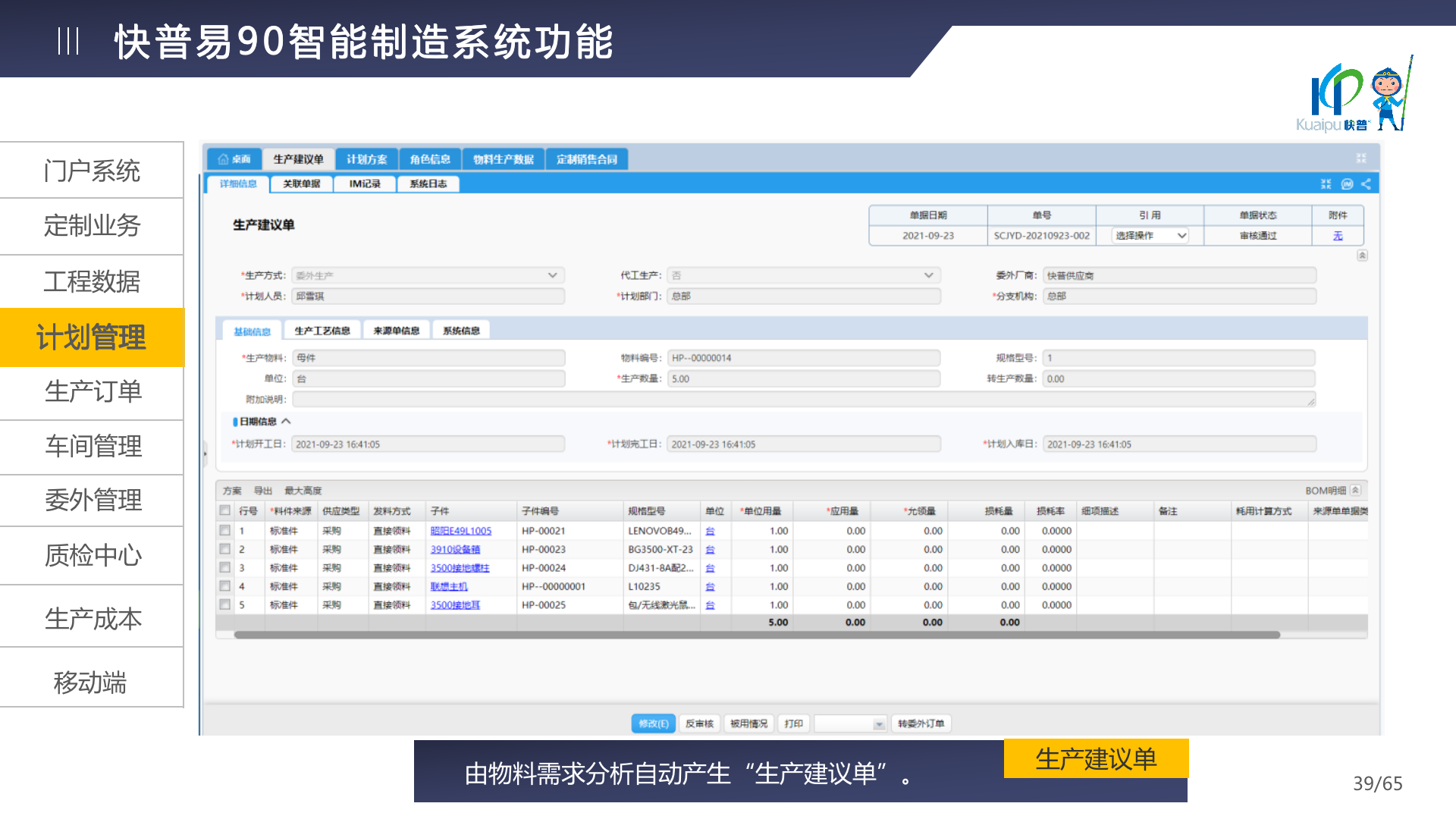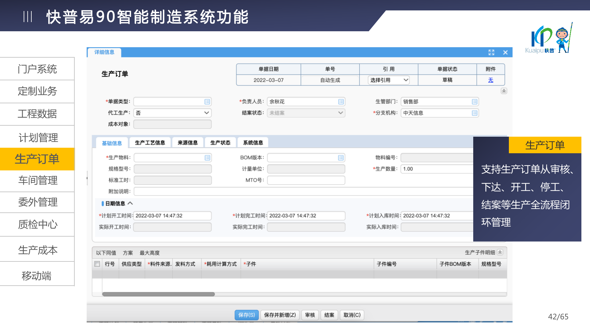 快普易90融合了大量精益生產(chǎn)管理的經(jīng)驗(yàn),涵蓋計(jì)劃管理、BOM管理、MRP運(yùn)算、生產(chǎn)訂單管理、供應(yīng)鏈管理、車間管理、出入庫(kù)管理、委外管理、質(zhì)量管理、生產(chǎn)成本核算、報(bào)表分析等全面生產(chǎn)管理,為企業(yè)打造實(shí)時(shí)感知變化、分析變化、提供決策的數(shù)字化管理平臺(tái),推動(dòng)企業(yè)創(chuàng)新的管理,實(shí)現(xiàn)“智能制造”的數(shù)字化轉(zhuǎn)型。