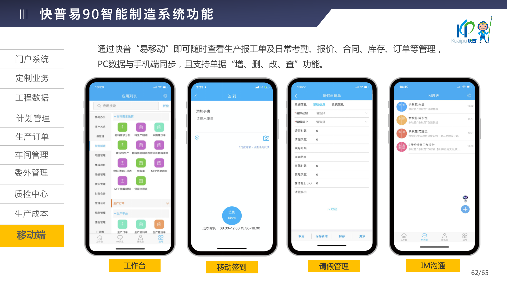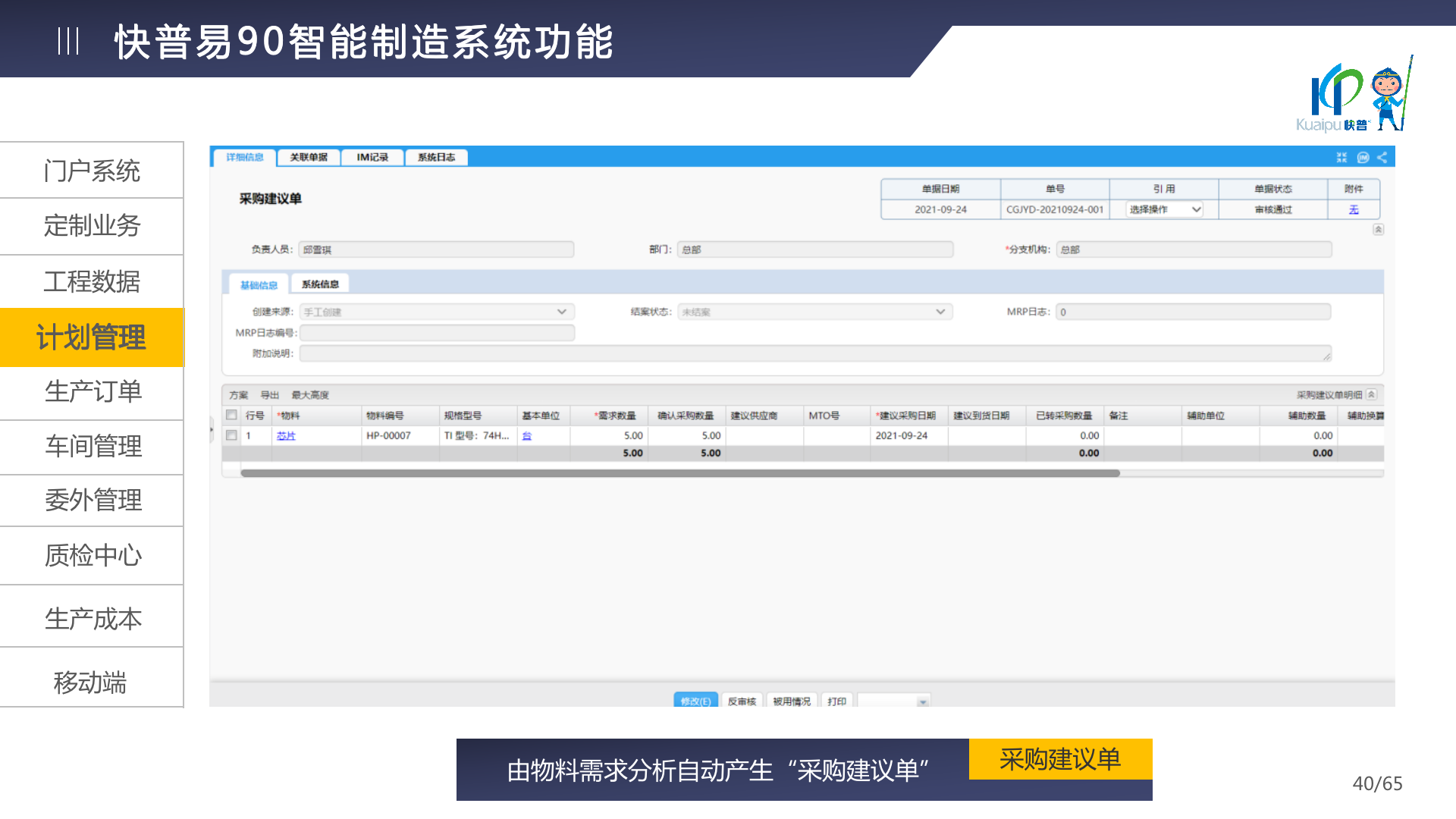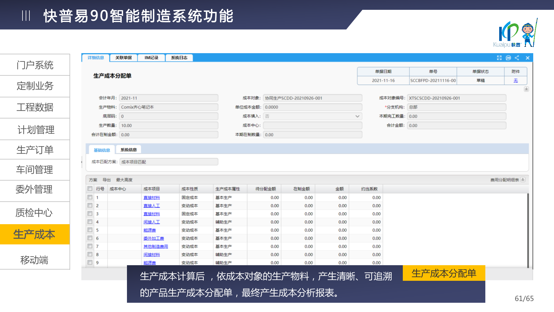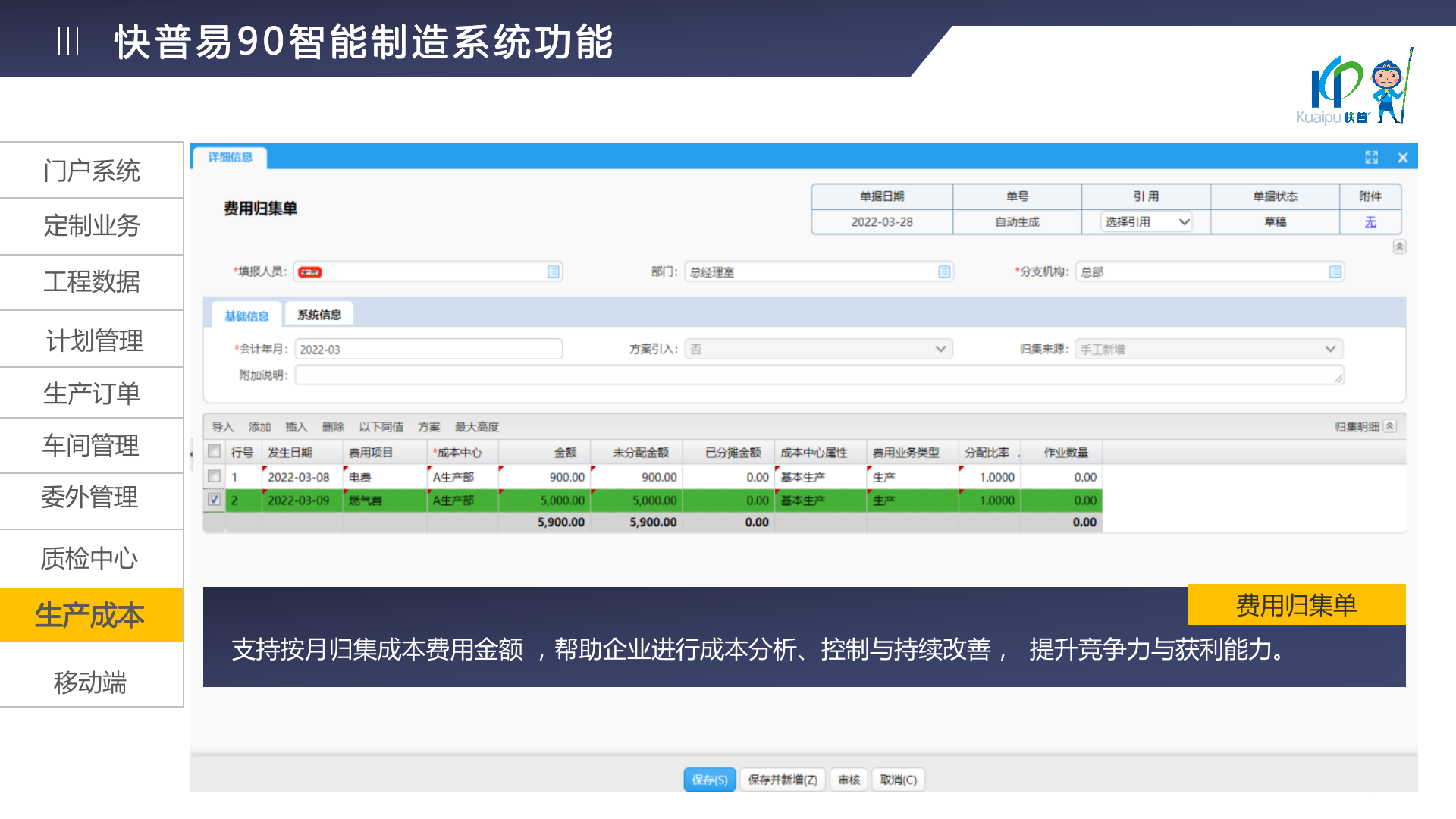 快普易90融合了大量精益生產(chǎn)管理的經(jīng)驗(yàn),涵蓋計(jì)劃管理、BOM管理、MRP運(yùn)算、生產(chǎn)訂單管理、供應(yīng)鏈管理、車間管理、出入庫(kù)管理、委外管理、質(zhì)量管理、生產(chǎn)成本核算、報(bào)表分析等全面生產(chǎn)管理,為企業(yè)打造實(shí)時(shí)感知變化、分析變化、提供決策的數(shù)字化管理平臺(tái),推動(dòng)企業(yè)創(chuàng)新的管理,實(shí)現(xiàn)“智能制造”的數(shù)字化轉(zhuǎn)型。